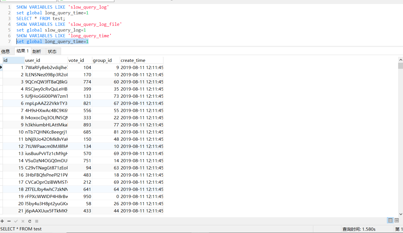(5)用本机测试:首先将阈值设置为1,执行sql语句SELECT * FROM test;用了1s多,然后查询慢查询文件已经产生了该条记录(如下图)
