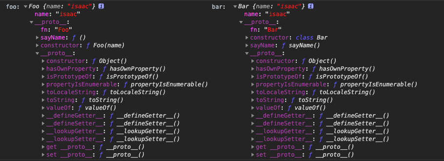 首先,可以看输出结果。很明显两个实例的结构上是基本一致的,类比一下,你可以猜到新语法“class”的实现本质,当然class也确实是传统实现的语法糖。