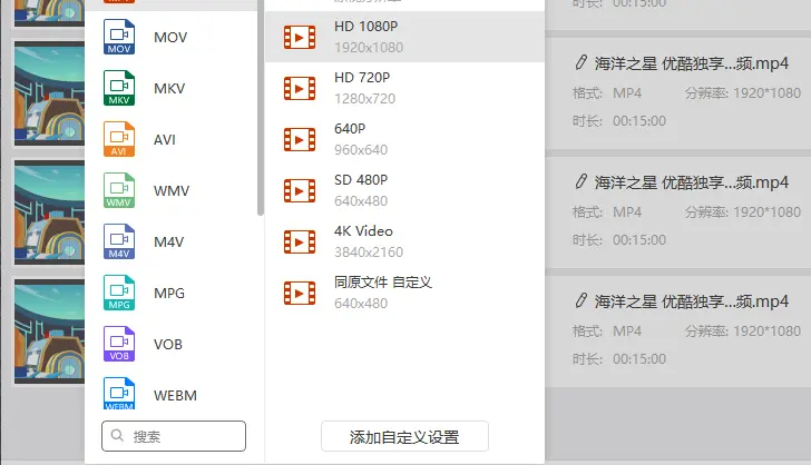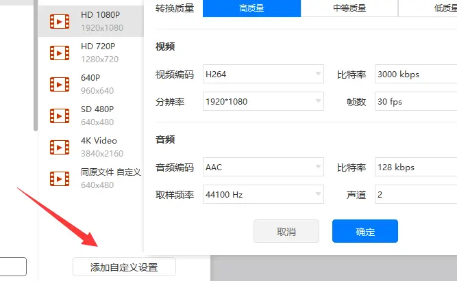 3、如果需要设置输出mp4视频的更多分辨率可以点击自定义设置,然后选择参数,