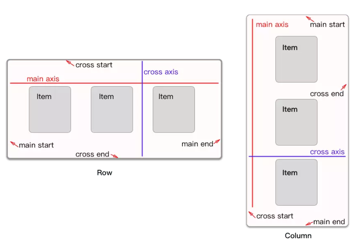 需要注意的是:Row中主轴方向为水平方向,Column中的主轴方向为垂直方向,如图: