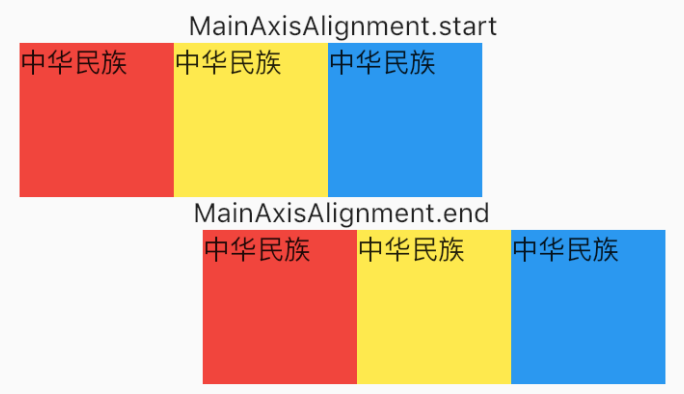 表示沿主轴初始方向,默认为这种效果,子组件布局方向沿着textDirection设定的布局方向,和start表示逆主轴初始方向,子组件布局方向逆着textDirection设定的布局方向,效果如图: