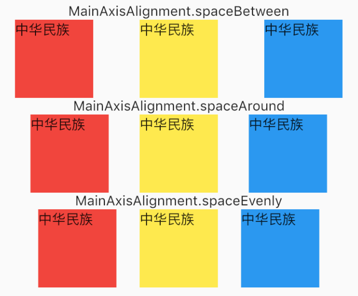 spaceEvenly表示在子组件之间均匀的添加空白区域,让每个组件和相邻的组件都有相同的间距,但是首尾距离父边界的距离和间距一样。