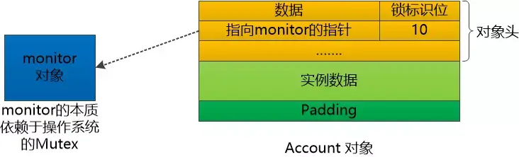 可是老大根本没有去找操作系统, 只是看了看这个account对象的所谓“对象头”,其中有个叫做Mark Word的东西,似乎是个什么数据结构, 里边有几个标识位,还有其他数据。