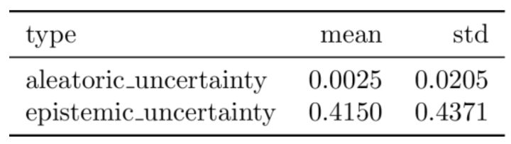 任意不确定性值往往比认知不确定性小得多,如表2所示。这两个值无法直接在同一图像上进行比较。 然而,在同一数据集可以和模型为其他图像预测的不确定性值进行比较。