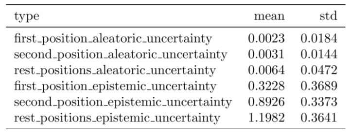 为了进一步探索不确定性,根据”right”logit的相对值将测试数据分成三组。在表3中,”first”包括所有正确的预测(带有”right”标签的logit值是最大值)。”second”,包括”right”标签是第二大logit值的所有情况。 “rest”包括所有其他情况。86.4%的样本属于“第一”组,8.7%属于“第二”组,4.9%属于“休息”组。表3显示了这三组测试集的任意不确定性和认知不确定性的均值和标准方差。正如所希望的那样,认知不确定性和任意不确定性与“right”logit的相对排序相关。这表明模型更可能确认不正确的标签,因为此时它不确定。此外,当模型的预测正确时,模型预测大于零不确定性(zero uncertainty)。期望这个模型能够展现出这种特性,因为即使模型预测正确,模型也不确定。