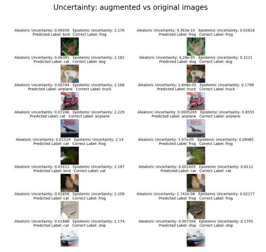 在数据增强后的图像,模型准确度为5.5%。这意味着伽马图像完全欺骗了模型。该模型没有经过训练,无法在这些伽马扭曲上得分。图18显示了左侧八个数据增强的图像以及预测不确定性和右侧八个原始图像和不确定性。前四幅图像是数据增强中任意不确定性预测最高,后四幅图像是数据增强中任意不确定性预测最低。