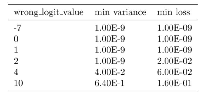 1. 当预测的logit值远大于任何其他logit值(图9右边)时,增加方差应该只会增加损失。这是正确的,因为在图9右边导数是负的。即增加“logit差异“,相比于同等的“logit差异”减少,只导致softmax分类交叉熵略微减小。在这种情况下,最小损失应接近0。