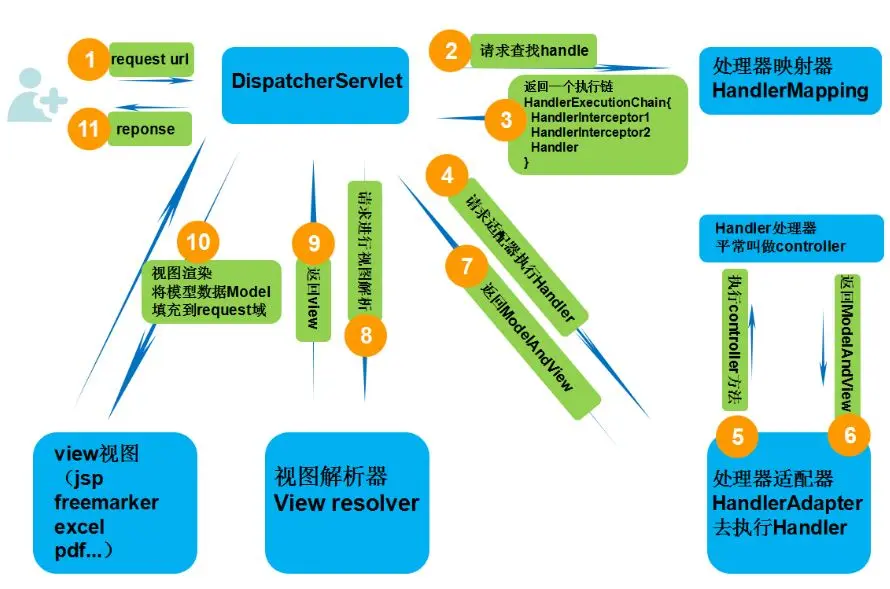 - 处理映射器向前端控制器返回handler,HandlerMapping会把请求映射成HandlerExecutionChain对象(包含一个Handler处理器(页面控制器)对象,多个HandlerInterceptor拦截器对象),通过这种策略模式,很容易添加新的映射策略;