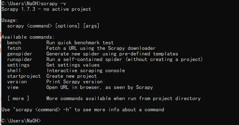 Windows上:在cmd或者编辑器的终端窗口里使用pip3 install scrapy,等待提示即可完成。输入scrapy -v可以查看版本以及帮助命令。如图: