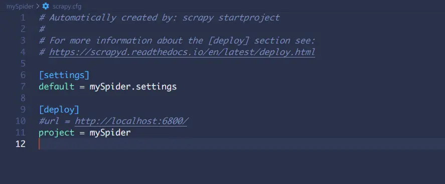在mySpider文件夹下面有一个spiders子文件夹和五个.py文件和一个.cfg文件。这里对结构做一个简要介绍。spiders文件夹下面是爬虫文件,__init__.py为此项目的模块文件,默认为空,暂时不用。items.py主要用来定义我们需要获取的数据。middlewares.py中间件文件,主要用来定义下载中间件和爬虫中间件的内容。pipelines.py处理获取到数据的文件。settings.py为项目配置文件,可以对项目进行一些自定义设置,比如开启或者关闭中间件,日志警告等级,启用或者关闭pipelines,以及其优先级的设置,是否开启cookies等。scrapy.cfg内的内容为下图:
