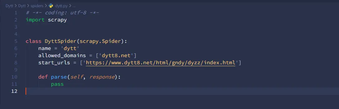 爬虫如何创建以及创建之后默认内容是什么上面已经说了。首先就是DyttSpider这个类,继承的是scrapy.Spider这个类,有兴趣的可以看看源码,这里不再多说。allowed_domains属性就是这个爬虫可以爬取的域名范围。start_urls就是这个爬虫开始的url地址。下面的parse方法就是对返回结果进行处理的函数,而且返回结果保存在response里面,我们可以使用正则、Xpath、CSS选择器等方法提取到我们想要的值。