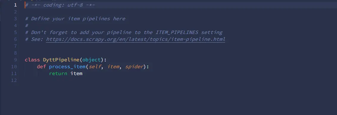 5、pipeline模块主要是对拿到的数据进行处理,而在settings.py文件中,pipeline模块是默认关闭的,所以需要手动开启。取消掉pipeline的注释即可。pipeline里的默认内容如下图: