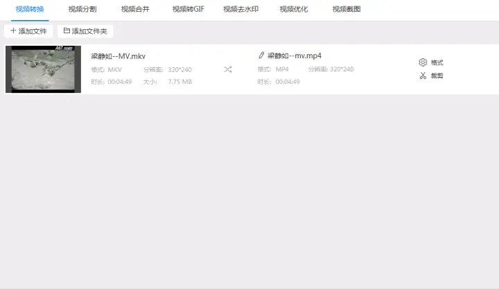 2、设置好功能栏的“视频转换”后把mkv视频格式的文件添加到软件中。添加的时候可以点击软件左上角的“添加文件”/“添加文件夹”按钮,也可以用拖拽的方式直接把视频文件拖拽到软件中。这几种方式都可以批量的添加文件或文件夹,可以根据个人的习惯选择添加的方式。