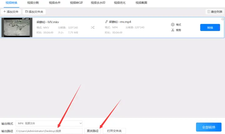 3、添加好mkv视频格式后设置好转换后的mp4视频的“输出路径”。在设置输出路径时可以在输出路径的输入框中直接写入要输出的位置也可以在点击“更改路径”按钮选择要输出到电脑的位置。