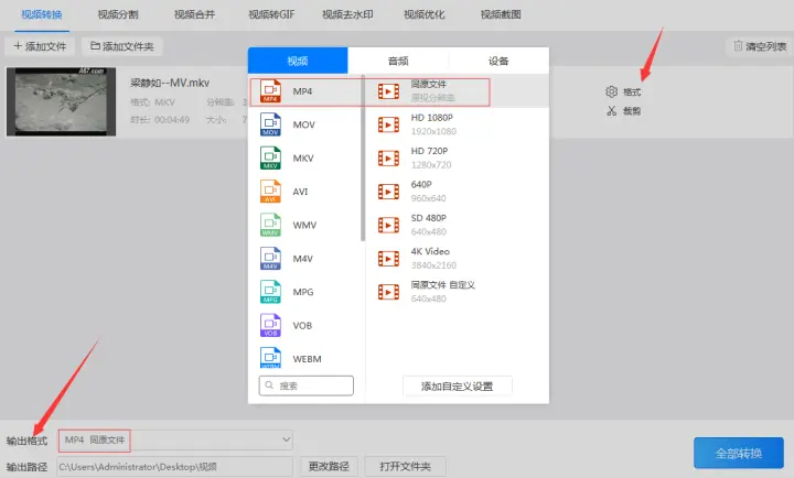 4、设置好“输出路径”后设置视频的“输出格式”。而输出格式又分为输出的视频格式和输出的视频分辨率。因为我们要把mkv格式转换成mp4格式,所以要把输出的视频格式设置为‘mp4’格式。