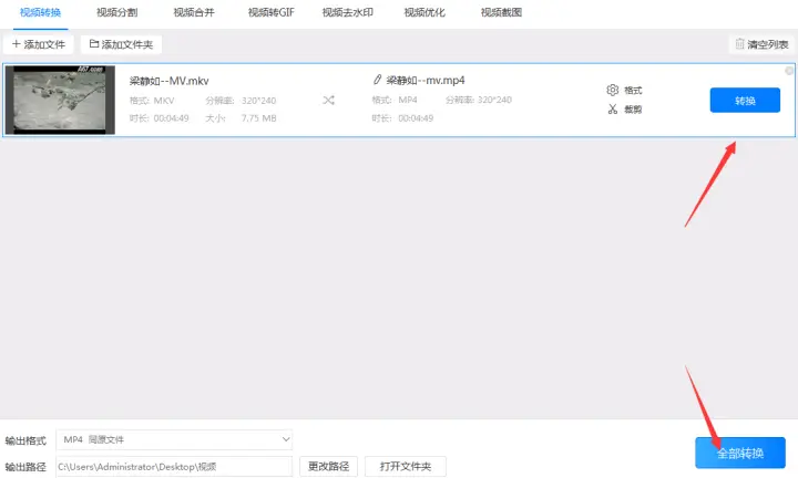 5、在以上都设置好后就可以点击“转换”/“全部转换”按钮把mkv格式转换成mp4了。在转换的时候软件会出现一个进度条,当进度条到达100%时就表示已经把mkv格式转换成mp4了,最后我们只需要点击覆盖在“转换”按钮上的“打开”按钮就可以打开之前预设的输出路径找到视频文件了。