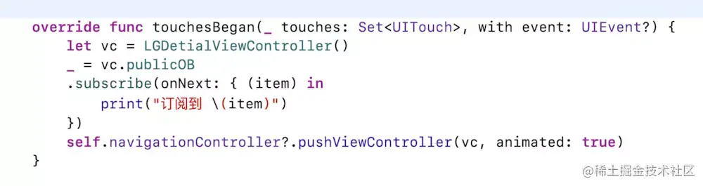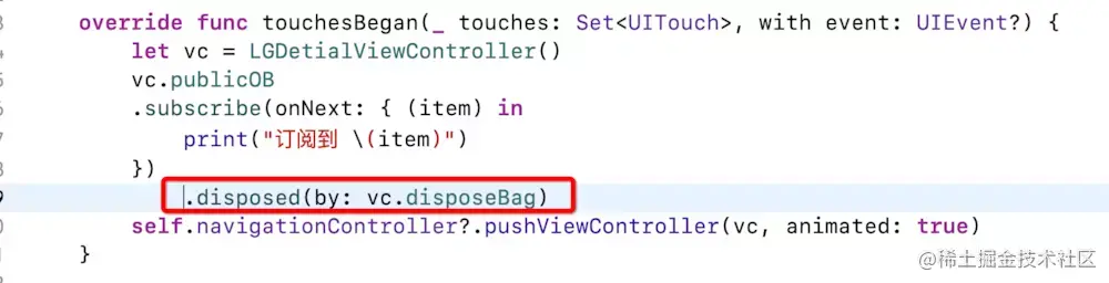 complete或者error信号达到 :及时回收,这样就不至于一直存在首页的垃圾袋中override func viewWillDisappear(_ animated: Bool) { super.viewWillDisappear(animated) // 页面要退出,及时完成以便调用dispose mySubject.onCompleted() }