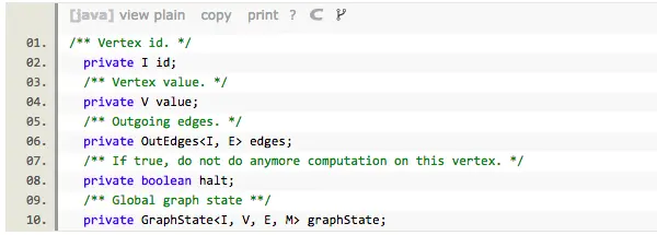 1.在Vertex类中,顶点的存储方式采用邻接表形式。每个顶点有 VertexId、VertexValue、OutgoingEdges和Halt,boolean型的halt变量用于记录顶点的状态,false时表示active,true表示inactive状态。 片段代码如下。
