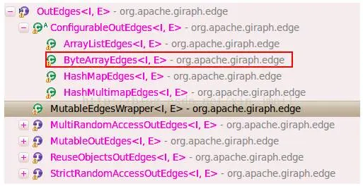 从上述说明文字可知,edge可以被重用,只需要修改targetVertexId和value的值就行。即每个Vertex若有多条出边,只会创建一个DefaultEdge对象来存储边。 3.org.apache.giraph.edge.OutEdges 用于存储每个顶点的out-edges。从Vertex类的定义可知,顶点的每条边都被存储在OutEdges类型的edge对象中,OutEdges接口的关系图如下: