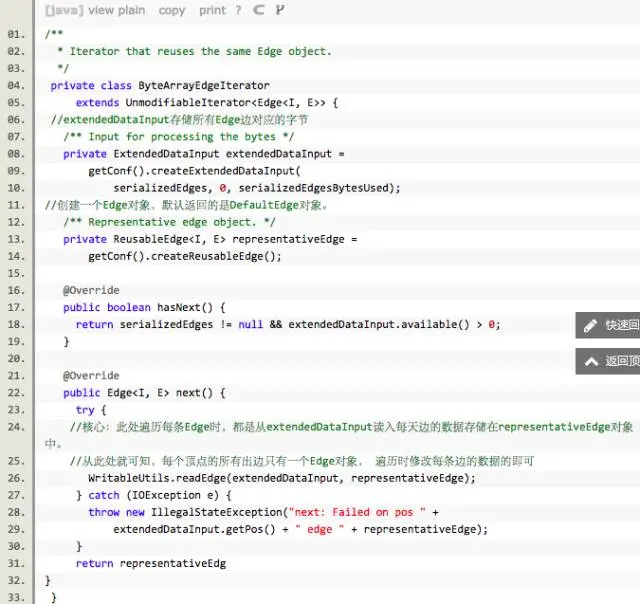 Giraph默认的使用ByteArrayEdges<I,E>,每个顶点的所有边都被存储在byte[ ]中。当顶点向它的出边发送消息时,需要遍历Vertex类中的edges对象。示例代码如下: