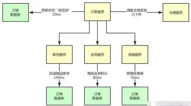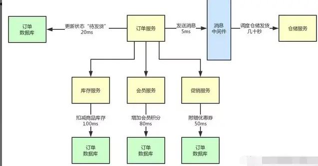 更新订单状态(20ms) + 扣减商品库存(100ms) + 增加会员积分(80ms) + 附赠优惠券(50ms) = 250ms。