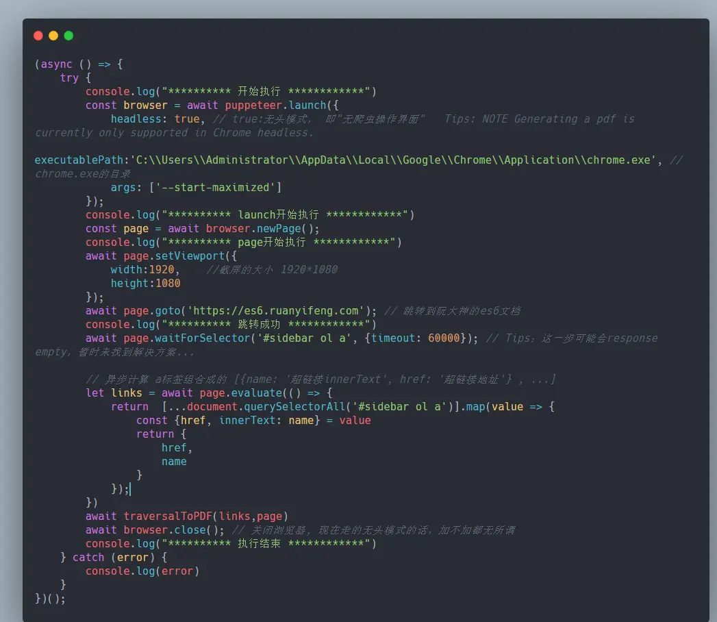 说到es6,一帮前端大佬可能会跳出来说:"es6真是太优雅了,解构赋值、正则表达式的扩展、Symbol Map Set等数据类型、Class语法糖、Promise、aysnc等等等等....",说了这么多,请问这些资料是哪里看来的呢,没猜错的话,基本都是从"阮一峰大神的ECMAScript 6 入门"获取的知识。那么,如果我想把在线文档变成本地的PDF该怎么办呢。。。这就用到伟大的爬虫技术啦。