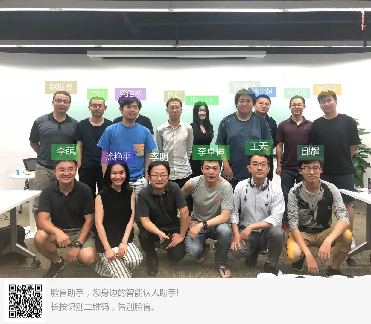 首先系统通过识别认出人脸,并自动把系统已经认识的人添加名字,针对未认识的或者认错的,您可以通过回复”改人名“来触发进入标记人名的过程,系统自动提出人脸,并生成一张带有序号的合成照片,如上图最右边。然后您可以通过”命名 1.小明,2.小芳“这样的格式来进行命名。 您还可以把这种合成图分享给朋友,朋友通过识别二维码即可进入”脸盲助手“服务号进行命名标注,帮助完成图片的标注。 完成标注后,即可得到一张如下图所示的带有名字标记的合照: