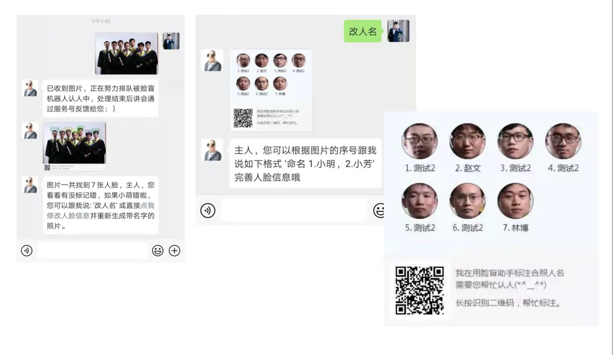 上图表示的是单张图的交互过程,如果系统认识,就直接给照片标记名字(以后会加上更多其他信息),如果不认识,则会问用户他是谁,用户可以直接在服务号中回复名字进行标记。 如果是合照,包含多个人脸,交互如下: