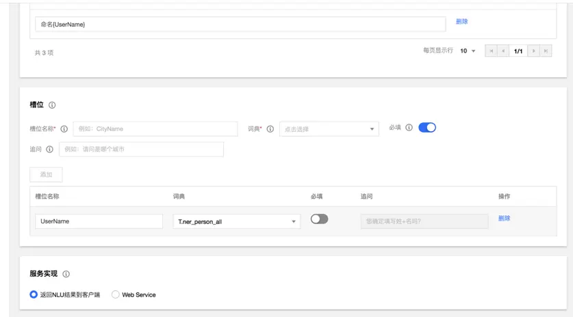 产品核心逻辑: 首先建立意图,如针对我标记人名的信息是一个意图,根据意图,需要添加一些触发意图的用户说法,例如说”命名xxx“,对于需要提取的信息,可设置槽位,如上图所示,人名是一个槽位。而每一个槽位可以关联一个词典。词典可自定义(目前只支持固定的词汇),也可选择内置(包含时间,地点,人物等)。然后匹配到信息后,你可以设置一段回复或者调用您自己的API进行下一步的操作。