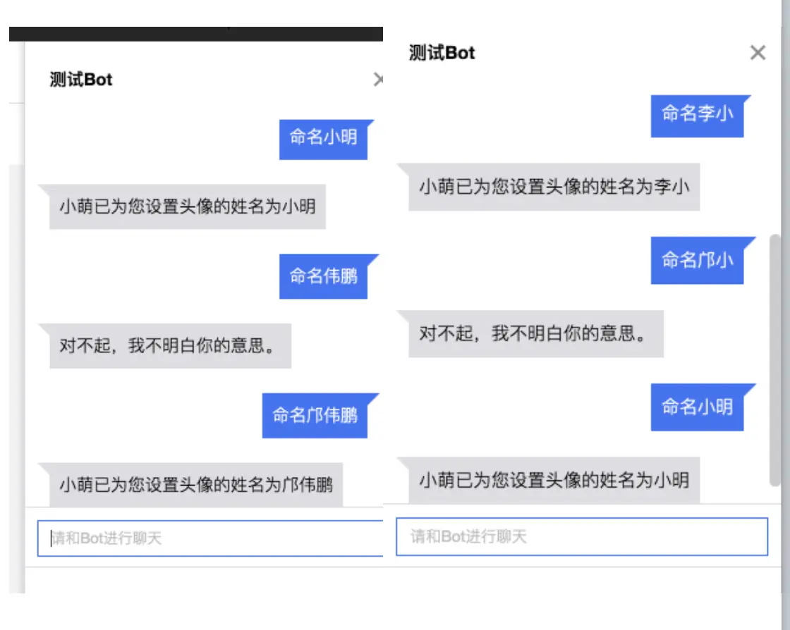 从上图可以发现,人名的识别出现的一些问题,如填写名而没有填写姓不行,填写姓+单字有一些可以,有一些不行。暂时还无法比较智能的识别出来。 笔者认为,由于人名的复杂性,各种可能都会出现,很难一次就准确判断是否人名,可以考虑放宽一点判断条件,在一些有可能误判的名字,增加多一轮对话跟用户确认,以便可以达到最终的意图, 而不是直接回答”对不起,我不明白你的意思“。 类似的包括公司以及职位等名词信息,都是各种可能都有,且会随着时间发展不断丰富。如何准确提取这类型的信息可能是Chatbot的一个无法避免的难题。也许增加多轮对话是一种思路,期待各位Chatbot的技术大牛的解决方案。