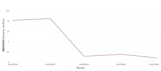 在Penelope发布之初就有的网页分类功能几乎消灭了这个风险,并实际上给了CS一个非常便利的指标来评估性能。目前的反欺诈系统(作为一个公司)的质量和CS部门检测由Penelope标记的网页的反应性紧密相关。Mes2Det是内部用于检测的指标。它是根据一个诈骗犯从被系统发现到上报的时间来计算的。可以清楚地发现,自Penelope启用以来,Mes2Det已经有了很大提升(从10小时到2小时),并且可以稳定运行几个月了。
