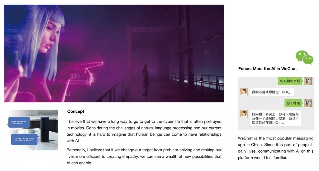 The main point is, the experience for users should be like “take the ancients to feel modern life today”, which means, the existence of ai should be integrated into the user’s daily life. After considering various plans: watch, brooch with web cam, headphones… Finally, we think that the idea in the movie Her is pretty appropriate: since the mobile phone is the most intimate and inseparable device in our life, a smart phone case became our choice.