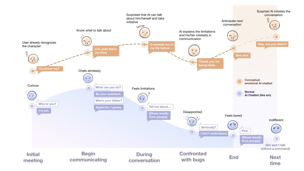Empathy and communication necessitate understanding and cooperation, meaning, as a designer, I must identify how to pique a user’s interest in conversing and facilitating long-term communication. The key objective is to make AI a narrator who exhibits self-awareness. I used the following journal map to find the entry points.