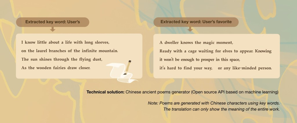 Technical solution: We used the Tuling robot (AI Chatbot service) as our base corpus, applied special mechanics in the back-end through itChat (in python3), and input keywords through the natural language processing platform Boson.