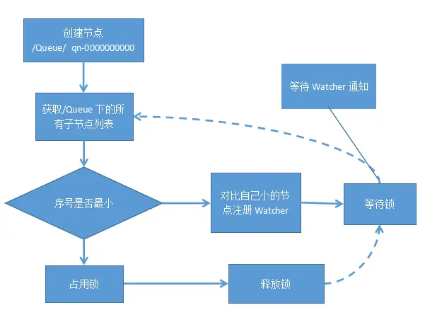 其大体设计思路也很简单,主要是在/SinaQueue下创建顺序节点,如/SinaQueue/qn-000000000,创建完节点之后,根据下面的4个步骤来决定执行的顺序。