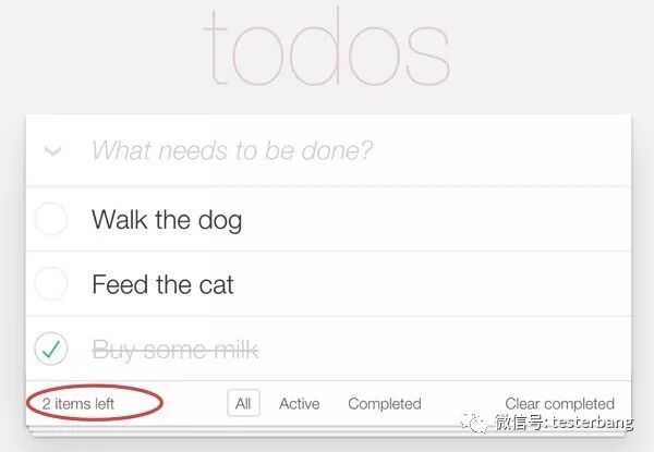 让我们在另外一个测试中,实际看一下这个原则。Todo应用在底部的左侧有一个计数器,它展现了剩余条目的数量(见图7)。