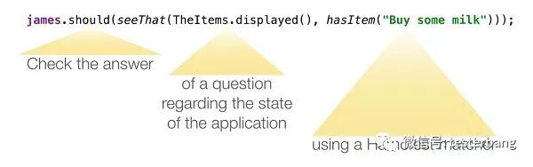 如你所料,这个代码会检查从应用中获取到的值(屏幕上展现的条目)与一个预期值(Hamcrest表达式所描述的)是否相符。但是,我们这里并没有传递实际值,而是传入了一个Question对象。Question对象的角色是回答关于应用准确状态的问题,这个问题会从actor的视角来进行回答,通常还会使用actor的ability来完成这一点。