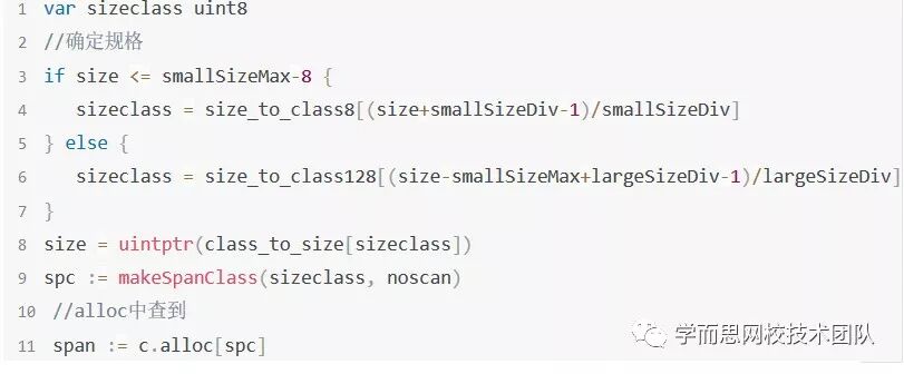 通过图示我们可以看到alloc[numSpanClasses]*mspan管理了很多不同规格不同类型的span,golang对于[16B,32KB]的对象会使用这部分span进行内存分配,所以所有在这区间大小的对象都会从alloc这个数组里寻找,看下源码: