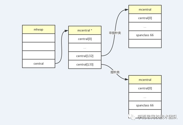 从上图可以更清楚的看到,一个mheap会有134种mcentral,而每一种规格的mcentral会挂载该规格的mspan链表。