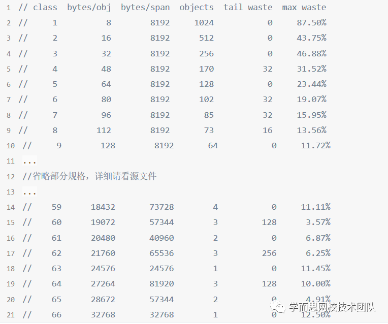 go1.12.6\src\runtime\sizeclasses.go,可看到下图的规格表
