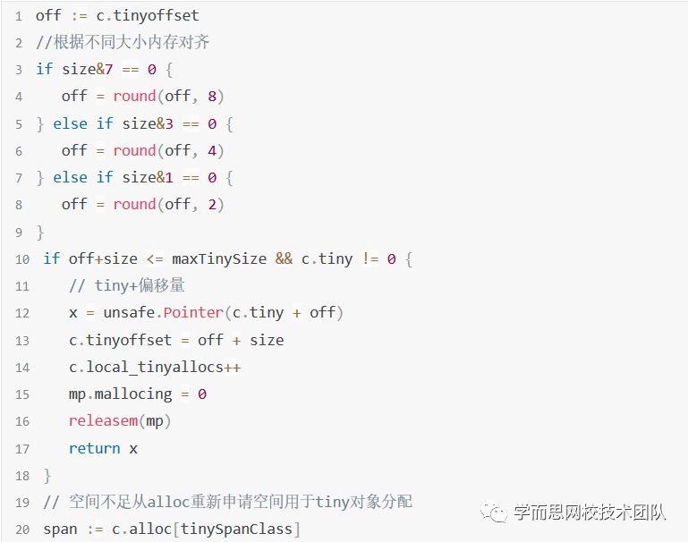 而对于更小的对象,我们叫它tiny对象,golang会通过tiny和tinyoffset组合寻找位置分配内存空间,这样可以更好的节约空间。 源码如下: