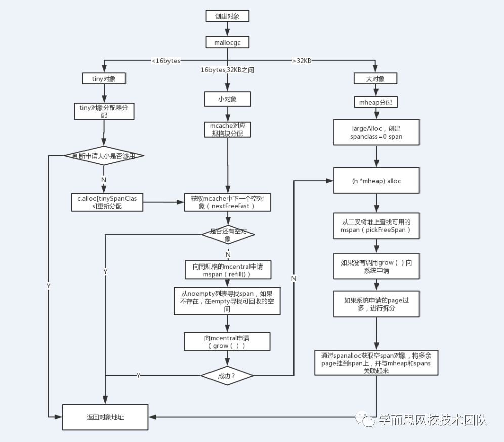 小对象内存分配,先向本线程mcache申请,发现mspan没有空闲的空间,向mcentral申请对应规格的mspan,如果mcentral对应规格没有,向mheap申请对应页初始化新的mspan,如果也没有,则向操作系统申请,分配页。