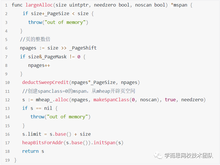 前面我们讲过tiny对象和小对象的内存分配,那大于 32KB 的对象怎么办呢? golang将大于32KB的对象定义为大对象,直接通过 mheap 分配。 这些大对象的申请是以一个全局锁为代价的,所以同时只能服务一个P申请,大对象内存分配一定是页(8KB)的整数倍。 结合源码再看一下: