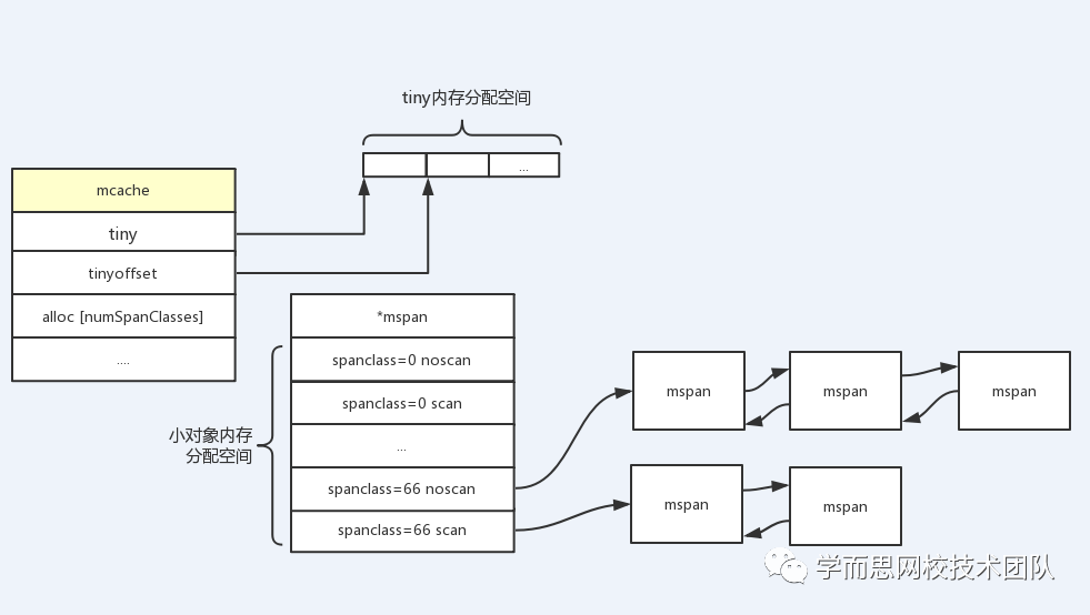 可以看到在mcache结构体中并没有锁存在,这是因为每个P都会绑定一个mcache,而每个P同时只会处理一个groutine,而且不同P之间是内存隔离的,因此不存在竞争情况。 关键字段都已经在代码中解释了,这里我们重点关注一下 alloc [numSpanClasses]*mspan,由于SpanClasses一共有67种,为了满足指针对象和非指针对象,这里为每种规格的span同时准备scan和noscan两个,因此一共有134个mspan缓存链表,分别用于存储指针对象和非指针对象,这样对非指针对象扫描的时候不需要继续扫描它是否引用其他对象,GC扫描对象的时候对于noscan的span可以不去查看bitmap区域来标记子对象, 这样可以大幅提升标记的效率。另外mcache在初始化时是没有任何mspan资源的,在使用过程中会动态地申请,不断的去填充 alloc[numSpanClasses]*mspan,通过双向链表连接,如下图所示: