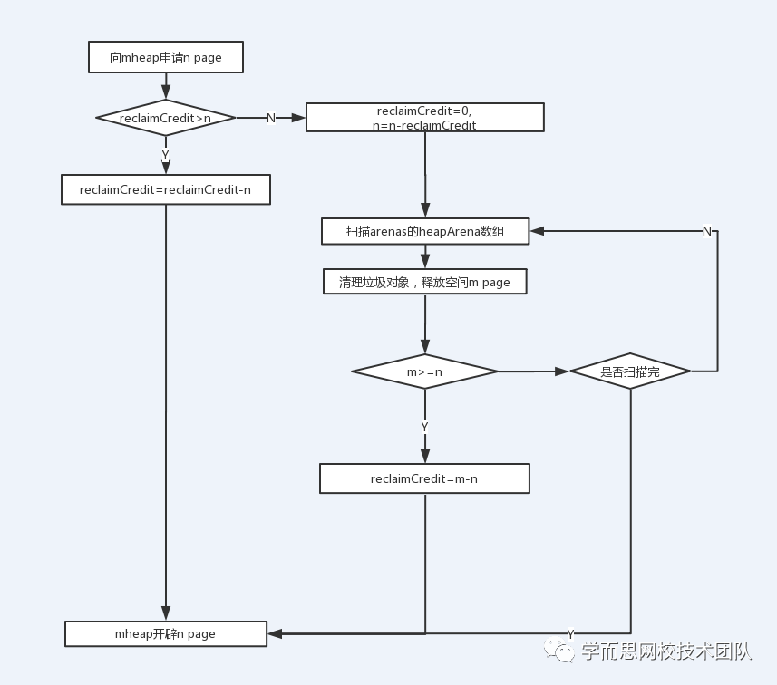 通过上节流程图和代码,我们可以清晰的知道一个对象内存申请的整个过程,那思考一下这个流程是否完善,我们都知道golang通过gc进行垃圾回收,而完整的gc需要两次stop the world,如果我们完全依赖gc去垃圾回收是不是影响整个程序的性能,我们假设一个场景,mcentral的span一直不够用,那会不断的去向mheap去申请page空间,导致mheap的使用率很快就触发到gc的阈值,启动gc处理过程,频繁的gc就会导致频繁的程序停服,极大的会影响程序服务性能,那golang的做法是怎么样的呢? ,在1.12版本里面golang对mheap结构添加了reclaimCredit 成员变量,每次mcentral向mheap申请新的page空间创建span的时候,都会先去扫描arenas里面的heapArena,去清理垃圾对象回收相同page数量的空间,由于扫描到的垃圾对象不可能正好等于相同page,多清理的page大小就会存到到reclaimCredit里面,下一次再扫描arenas的时候会先去抵消reclaimCredit,如果不够才会去扫描heapArena。 通过这种方式有效的防止mheap使用率过快增长,下面是整个流程图: