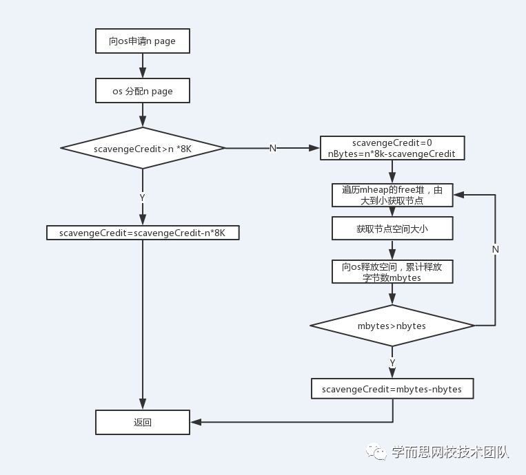 同理,我们知道当mheap不够用的时候,会去向操作系统申请内存空间,如果增长过快,也会造成整个操作系统的不稳定,golang对这部分也做了处理,1.12版本mheap引入scavengeCredit 这个成员变量,当向操作系统申请内存空间的时候,会先去扫描free这个二叉树堆,span从大到小的扫描,释放所需大小的空间给os,多余释放的到小会存储到scavengeCredit中,下次再次扫描的时候会先扣除这个值。 下面是整个流程图: