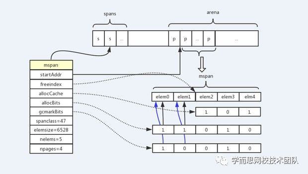 根据源码和上图结合来看,会更加容易理解mspan,每一个mspan就是用来给程序分配对象空间的,也就是说一般我们对象都会放到mspan中管理,这里我们重点解释一下如图所示的几个属性,startAddr 是该mspan在arena区域的首地址,freeindex 用来表示下一个可能是空对象的位置,也就是说freeindex之前的元素(存储对象的空间)均是已经被使用的,freeindex之后的元素可能被使用可能没被使用,allocCache是从freeindex开始对后续元素分配情况进行缓存标记,通过freeindex和allocCache结合进行查找未分配的元素位置效率会更高,我们能快速的找到一个空对象分配给程序使用,而不用全局遍历。 allocBits用来标识该span中所有元素的使用分配情况,gcmarkBits 用来sweep过程进行标记垃圾对象的,用于后续gc。