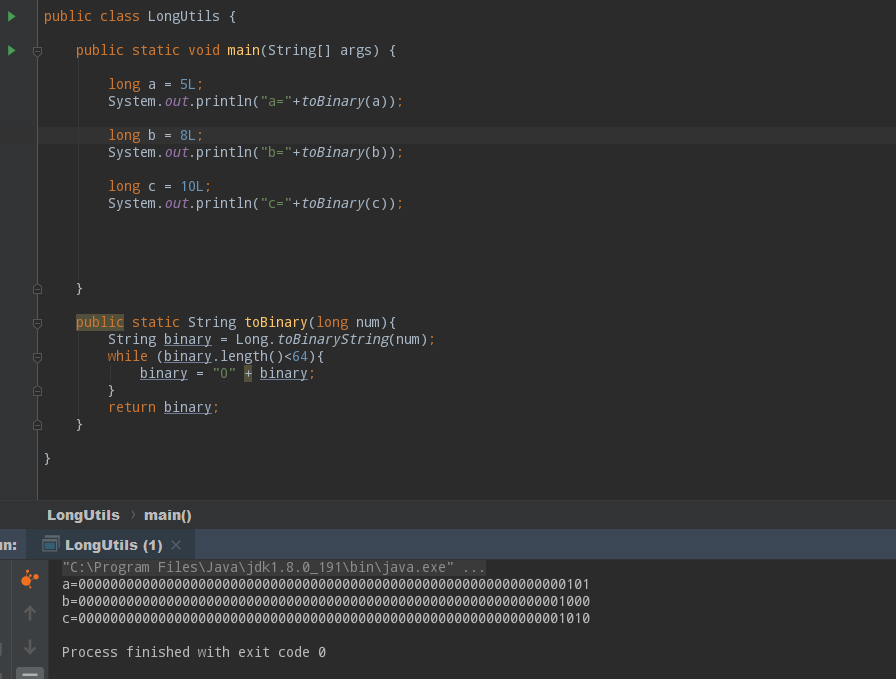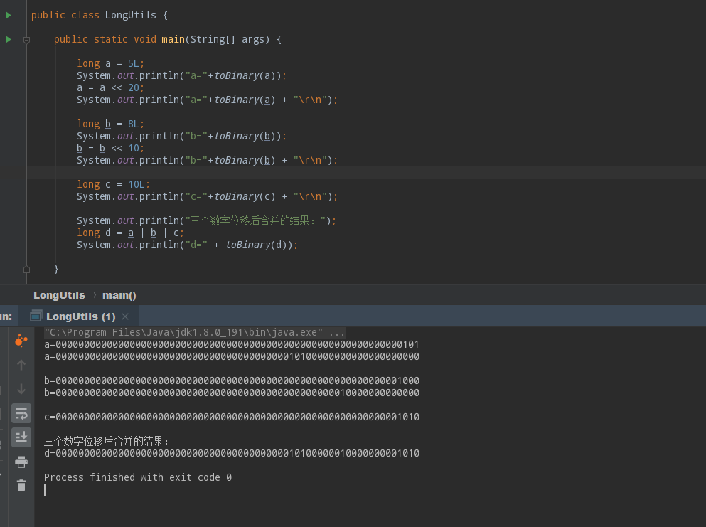 上面的“a|b|c”操作就是合并三个数字,怎么合并呢?就是多个64位的数字对应的合在一起,在这64中,只要对应位数上有一个位置是1,合并后这个位上的数字就是1,否则就是0,根据这个结果,我们看到数字d的二进制形式确实包含了abc三个的所有数字。虽然最后的结果d是一个难以猜到的数字,但是我们进行位运算一定要看二进制,不要看整数字面值,这三个数字放在了各自对应的位数范围内,只要三个数字的范围不越界,也就是说a永远在从右向左20位以后,b永远在10到20之间,c永远在0到10之间,那么这三个数字就可以各管各的,并且结果是合法合理的。