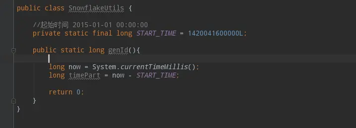前面的理论基础和位运算都了解了,下面我们来生成雪花算法的第一部分,也就是时间部分。时间部分的逻辑起始很简单,就是规定一个起始时间戳,然后用当前时间戳减去起始时间戳,这两个数的差就是我们要的结果。简单看一下代码逻辑: