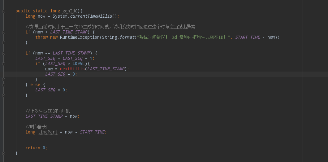 前面的内容把雪花算法的时间部分和机器信息部分都生成了,下面来生成最后一部分,就是毫秒内的序列。什么意思呢?我们在生成时间部分获取时间戳的时候,使用 long now = System.currentTimeMillis(); 获取,是个毫秒级的时间戳,但是即使是这么短的时间,对于电脑来说也足够生成很多个id,所以很多id可能会在同一个毫秒内生成,也就是时间部分的数值一样。这个时候就要让同一个毫秒内生成的id加上数字序列标识,就是第三部分的序列。第三部分占的长度是12位,转成整数值就是4095,所以最后一部分的范围就是4095到0之间的数字。如果毫秒内访问的数量超过了这个限制怎么办?没法解决,只能强制等到下一毫秒再生产id。这就是第三部分的作用。